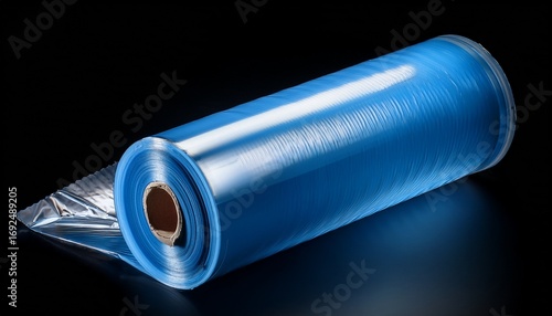 a roll of translucent dark blue stretch film on a cardboard core isolated against a black background