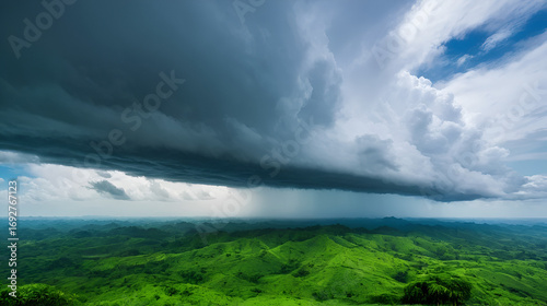 Atmosphere of the Indian monsoon season, with raindrops, lush greenery, and cloudy skies