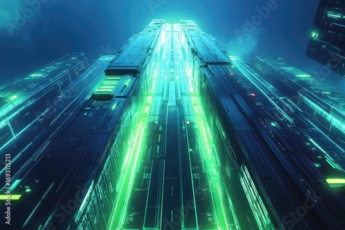 Futuristic cityscape at night, towering skyscrapers with vibrant green neon lights illuminating the intricate technological details.