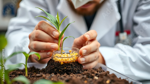 Scientific specialist plants genetically modified corn grains in the prepared soil for cultivation. Close-up of his hands holding Petri dish. The concept of creating food in an artificial environment