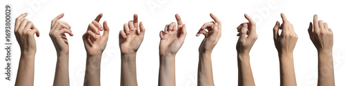 Collection of human hands with raised index finger shown in different positions including front,