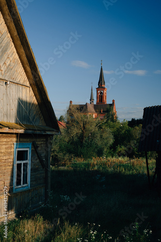 Old ancient church of St Anthony of Padua by river in Postavy, Vitebsk region, Belarus.