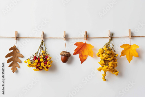 Dekoracyjna kompozycja jesiennych elementów: liście dębu i klonu, suszone kwiaty oraz żołądź, zawieszone na sznurku, przypięte drewnianymi spinaczami.