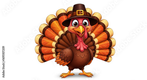 Cartoon turkey wearing pilgrim hat, orange brown feathers, white background, Thanksgiving illustration, festive, cheerful, autumnal, holiday graphic