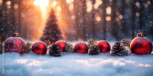Czerwone, świąteczne bombki i szyszki na zaśnieżonej ziemi. W tle, o zachodzie słońca, widać zaśnieżone drzewa i choinki, co tworzy magiczną, zimową kompozycję o ciepłym, naturalnym świetle.