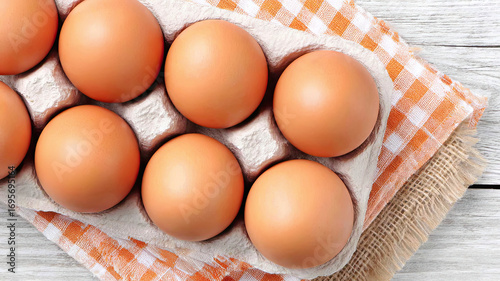 Fresh photography Fresh Brown Eggs in Carton on Checkered Cloth captured in natural light, cinematic composition for commercial use and stock image licensing