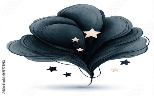 Dark, swirling cloud, layered petals, scattered stars
