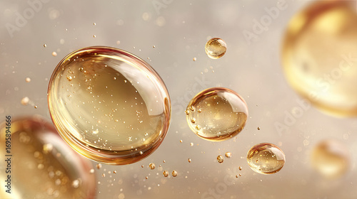 Floating Golden Cosmetic Oil Drops in a Light Abstract Background