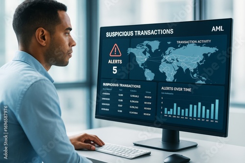 Business analyst monitoring suspicious financial transactions on desktop screen in modern office environment with light background and data charts. Ai generative