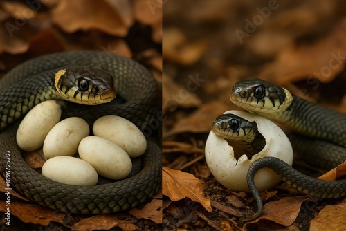 Grass snakes with eggs, illustrating the reptile's life cycle in natural setting