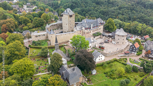 Castle Burg at Solingen region with a drone fly over during Autumn time window