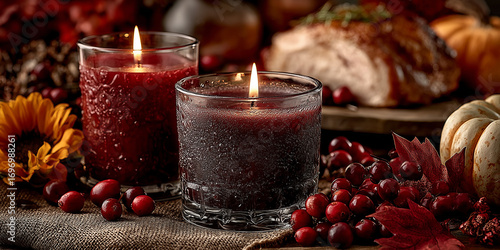 Zbliżenie na jesienną dekorację z dwiema świecami, obok nich znajdują się czerwone owoce i jesienne liście. W tle widać pieczone mięso.
