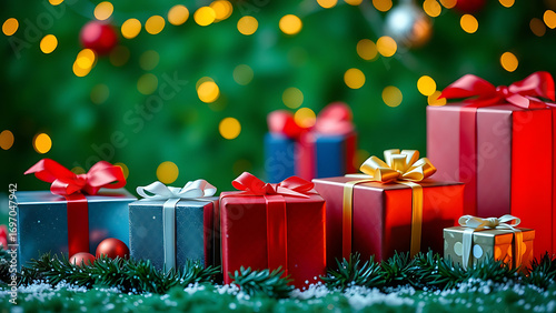 Christmas background with gift boxes over green backdrop Xmas celebration preparation for winter hol