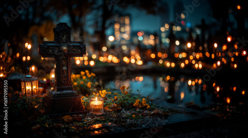 Cmentarz nocą, płonące znicze i krzyż – Wszystkich Świętych, listopadowa zaduma, pamięć o zmarłych