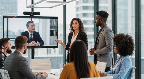 Hispanic businesswoman giving presentation to diverse business team during video conference with male senior asian manager or CEO in modern office