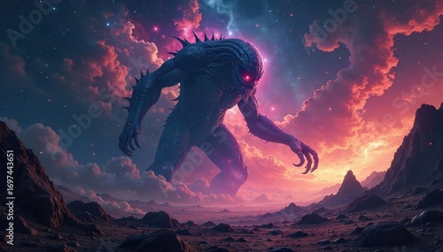 A colossal cosmic entity, its form obscured by swirling nebulae and celestial debris, looms over a distant, terrified planet Its tentacles reach out, grasping at the stars , space, destruction