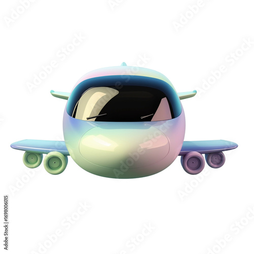A whimsical, iridescent 3D rendering of a cartoon airplane with a rounded fuselage and stubby wings.