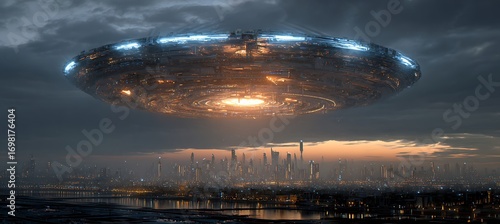 Massive alien spaceship hovers ominously over a sprawling futuristic city at dusk