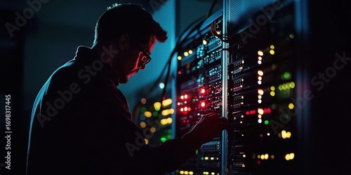 A silhouette of a technician working on hardware inside a dimly lit server room. The glowing lights from the server racks highlight the technological environment and critical operations
