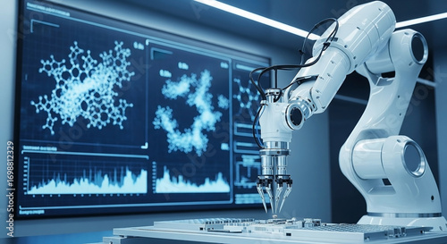 Robotic arm conducting scientific research in a high-tech lab, demonstrating automation, artificial intelligence, and future technological innovation