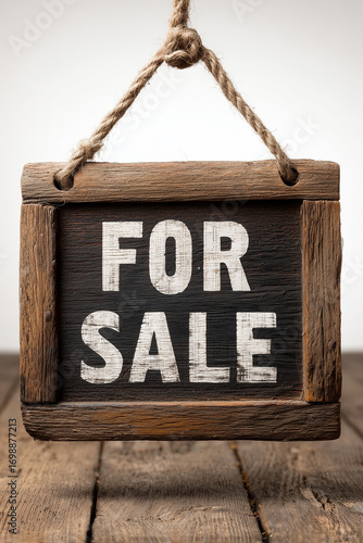 Drewniana, rustykalna tabliczka z napisem "FOR SALE" wisi na sznurku, na tle desek i białego tła, co sugeruje sprzedaż nieruchomości lub przedmiotów.