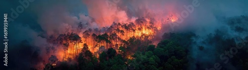 Aerial view of massive wildfire with smoke concept. Dramatic wildfire destroying forest, showcasing nature's fury.