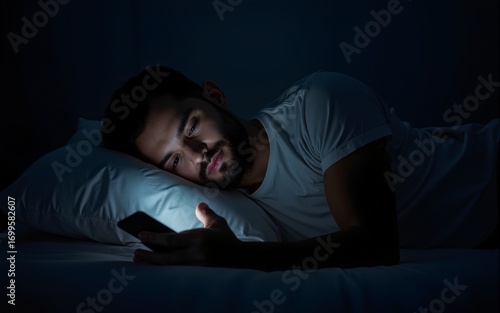 A sleepless man lying in dark bedroom with mobile phone in hands and scrolling endlessly. High quality