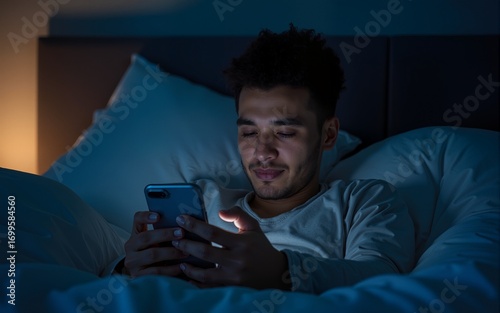 A man lying in bed at night and doom scrolling on social media ignoring sleep. High quality