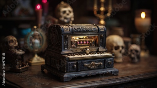 Fantastical Miniature Organ Glowing in a Macabre, Skull-Adorned Study
