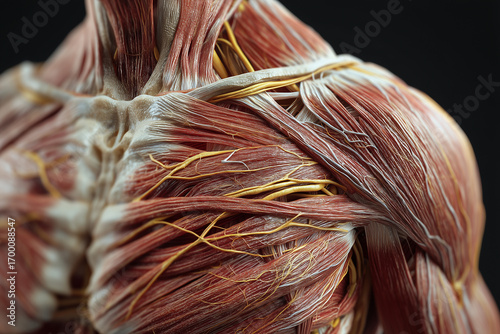 Anatomiczna wizualizacja mięśni – detal klatki piersiowej i ramienia człowieka