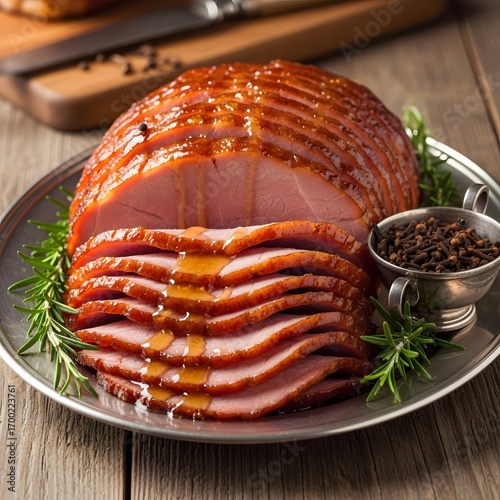 Delicious glazed ham with cloves and rosemary on a silver platter for a holiday feast table 96