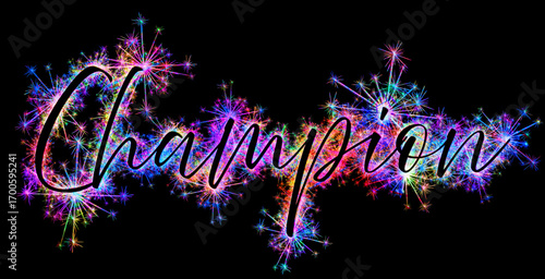 Kolorowe zimne ognie i fajerwerki układające się w kształt słowa CHAMPION w języku angielskim
