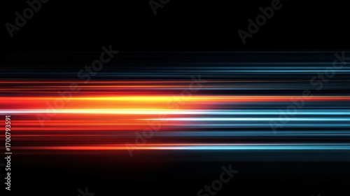bright light streaks in red orange and blue on black background with glowing horizontal lines in motion blur effect