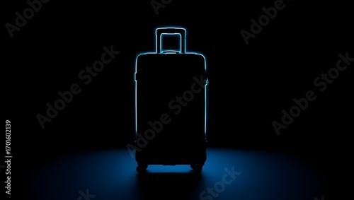 Sleek black suitcase illuminated by dramatic blue light against a dark background