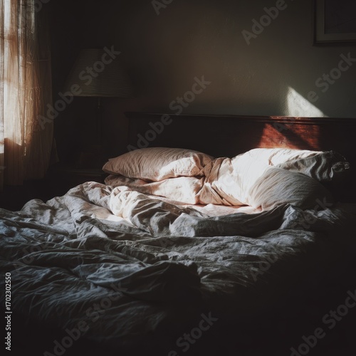 Cozy bedroom scene with soft light streaming through a window onto a rumpled bed with pillows
