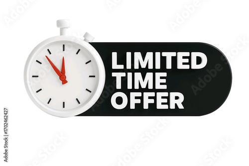 White stopwatch next to a black oval sign with white text reading limited time offer isolated on transparent background
