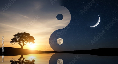 Serene landscape merges day and night symbolized by yin yang, reflecting balance and harmony