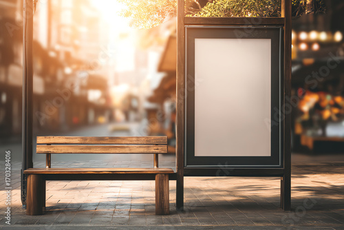 Empty wooden bench at a bus stop next to a blank advertising board in an urban street setting during a warm, sunny day