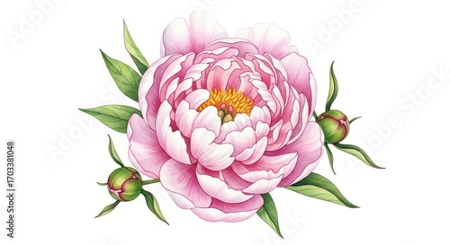 Delicate, detailed illustration of a vibrant pink and white peony flower with accompanying buds and leaves against a plain white background.