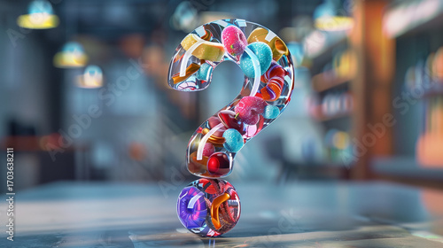 A whimsical question mark made of glass is filled with a variety of candies. A whimsical question mark is filled with vibrant candies and objects, representing curiosity and seeking answers. AI genera