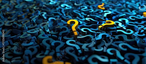 A dense field of dark-blue question marks with a few gold ones interspersed, creating a visually intriguing texture and raising questions about choice, uncertainty, and the search for answers