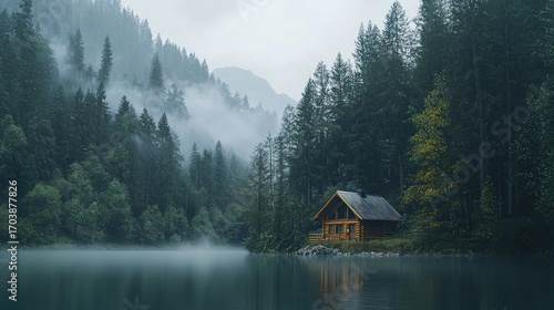 A wooden cabin nestled in a dense forest by a tranquil lake, with misty mountains in the background.