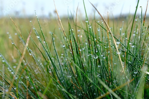 Trawa z kroplami rosy o poranku w naturalnym środowisku