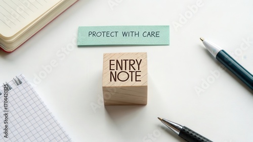 Wooden Stamp with Entry Note and Protect with Care on Table