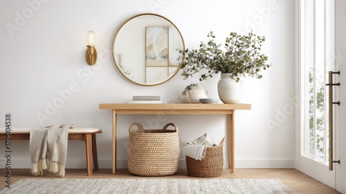 modern scandi entryway, ash wood console table, round mirror, woven basket, neutral rug, white walls, warm sconce light