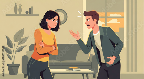 A furious man shouting at a frustrated woman during a domestic dispute, a concept of marital problems and communication breakdown