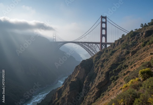 Un largo puente colgante que se extiende a través de un vasto cañón, con una suave niebla elevándose desde el río, enfatizando la grandeza y la gracia arquitectónica