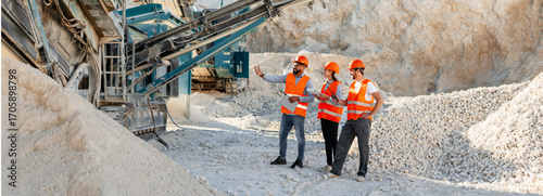 Engineers inspecting rock crushing machine in quarry