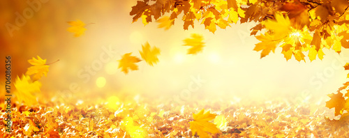 Fall autumn maple tree foliage on blurred background with bokeh, leaves flying on wind, autumnal festive wide panoramic banner with empty copy space.