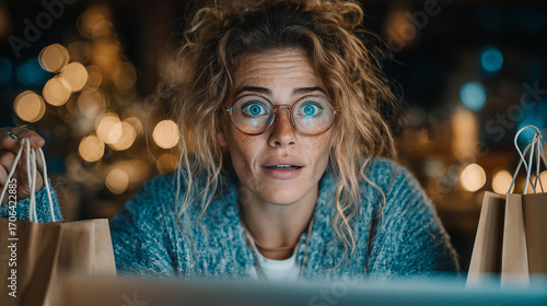 Kobieta w okularach, z zaskoczonym wyrazem twarzy, patrzy w dół. W jej okularach odbija się ekran. W tle widać rozmazane światła.